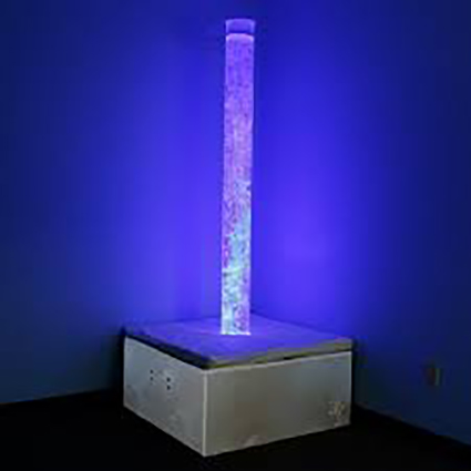 استاند جهاز فقاعات الماء وهو مصمم لعمود الفقاعات وهو مبطن بطبقة من الاسفنج والجلد ذات الكثافة العالية للحفاظ على العمود من السقوط نتيجة لاستخدام الاطفال وحمايته وهو مريح للاطفال اثناء الجلوس واللعب مع لون البطانة التى تتناسق مع بطانة الغرفة ولونها ومزود بعجلات وذلك لسهولة تحريك عمود الفقاعات من مكان الى اخر لان الوزن يكون كبير وهذا الاستاند يتحمل عمود واحد بمقاساته المختلفة ويمكن وضع الالياف البصرية بداخله فبذلك يكون الاستاند ضروريا للغرفة الحسية
