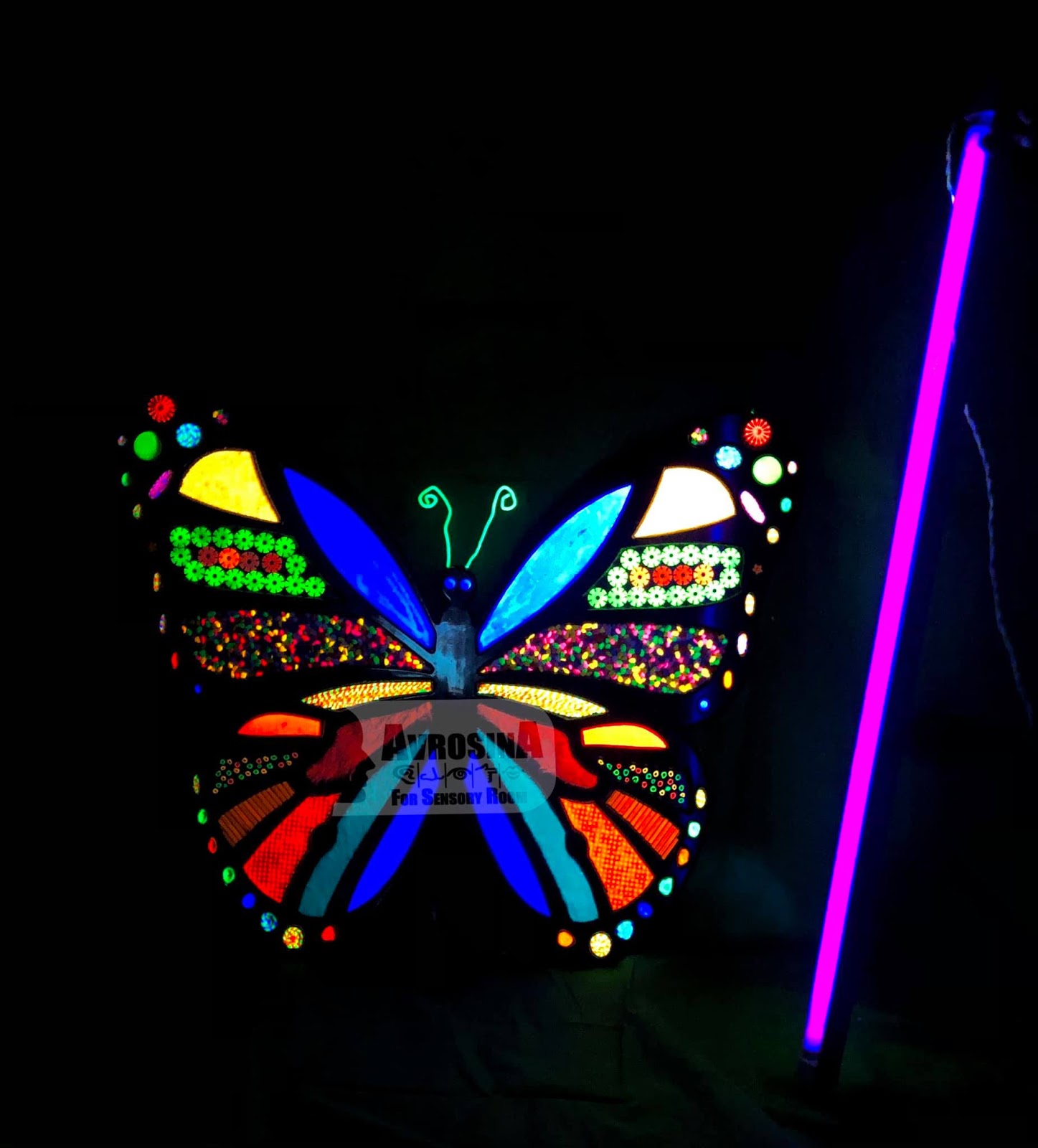 حائط اللمس الفسفورى الذي ياخذ شكل الفراشة بألوانها المميزه الفسفورية وهو من الادوات المميزة والمبهرة داخل الغرفة الحسية والغرفة المظلمة حيث ان لونها الاسود والادوات والملامس الموضوعة عليها تتفاعل مع لمبه الاشعة الفوق بنفسجية الموجودة بالغرفة مما يؤدى الى تحفيز بصرى وجذب انتباه الاطفال مع وجود الملامس الفسفورية المتنوعة فهى اداء متعددة الحواس ومتعددة الاستخدامات وهى مهمة جدا لما تقوم به من نتائج رائعة مع اطفال التوحد والنشاط الزائد